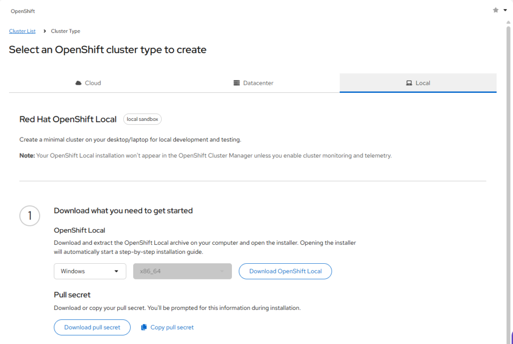 OpenShift LocalのCLIツールおよびプルシークレットをダウンロードします。プルシークレットとは、コンテナイメージをダウンロードするための認証情報で、CLIツールを用いた後述の作業で必要になります。