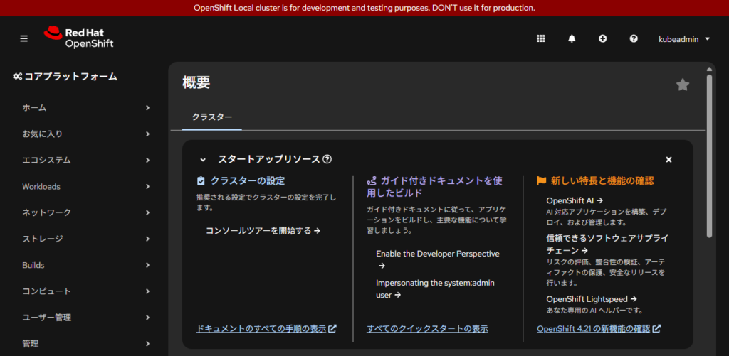 本記事では、OpenShift Localを実際にセットアップし、基本的な動作確認やWebコンソールへのアクセス方法、OpenShiftクラスタの停止方法を紹介します。これからOpenShiftに触れてみたい方や、検証環境を手軽に構築したい方の参考になれば幸いです。